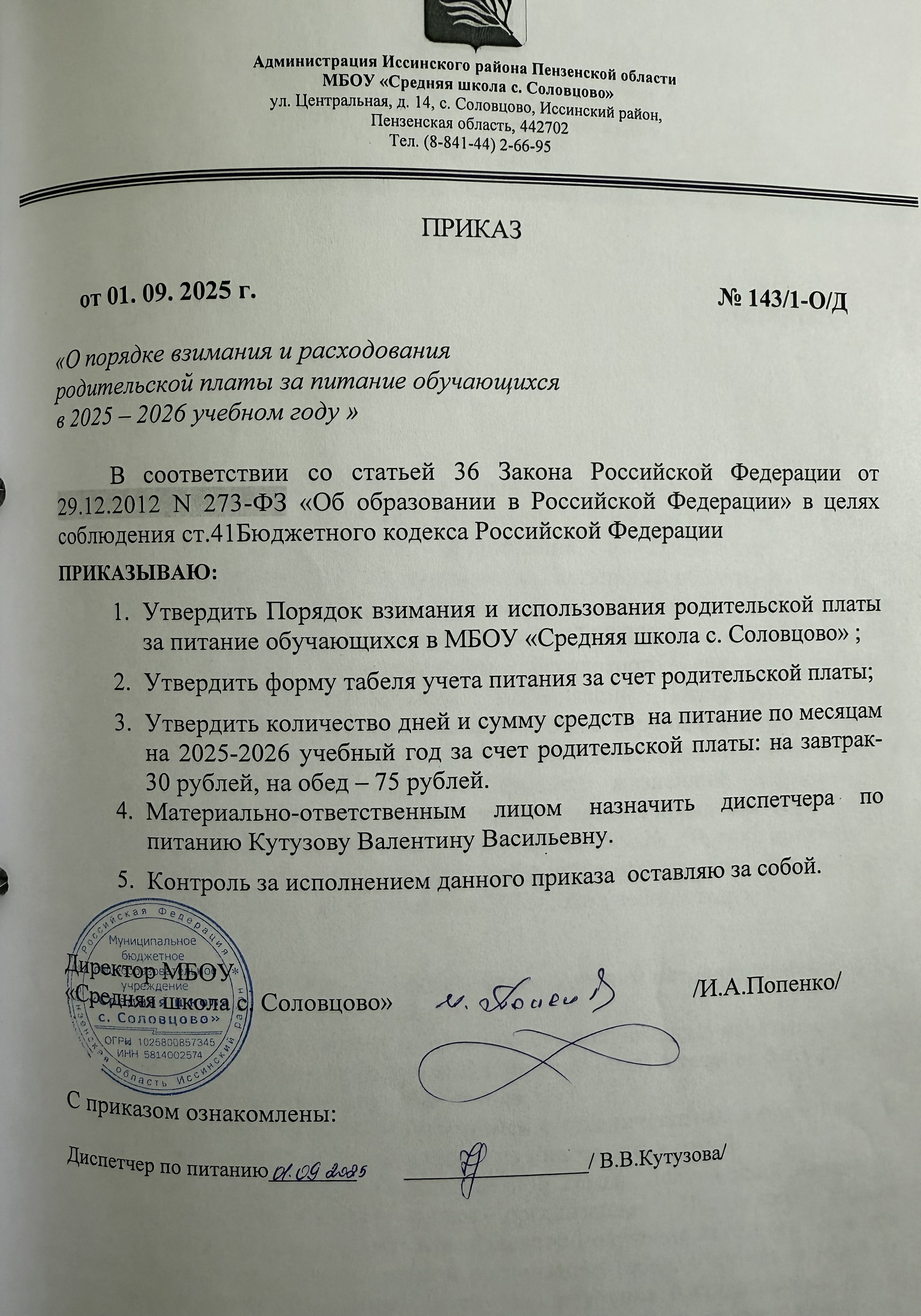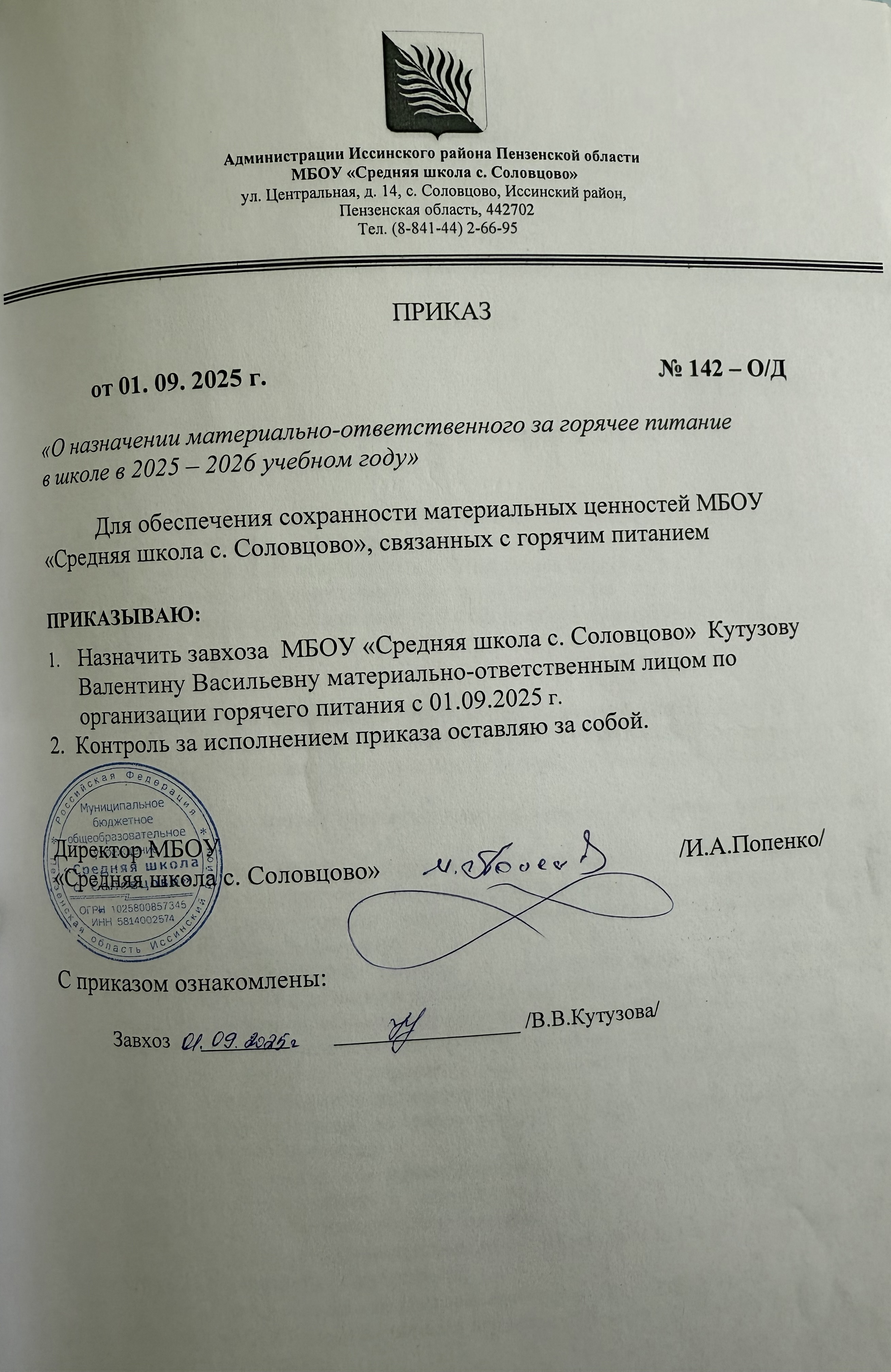 Приказ о назначении материально-ответственного за горячее питание в школе в 2025-2026 учебном году