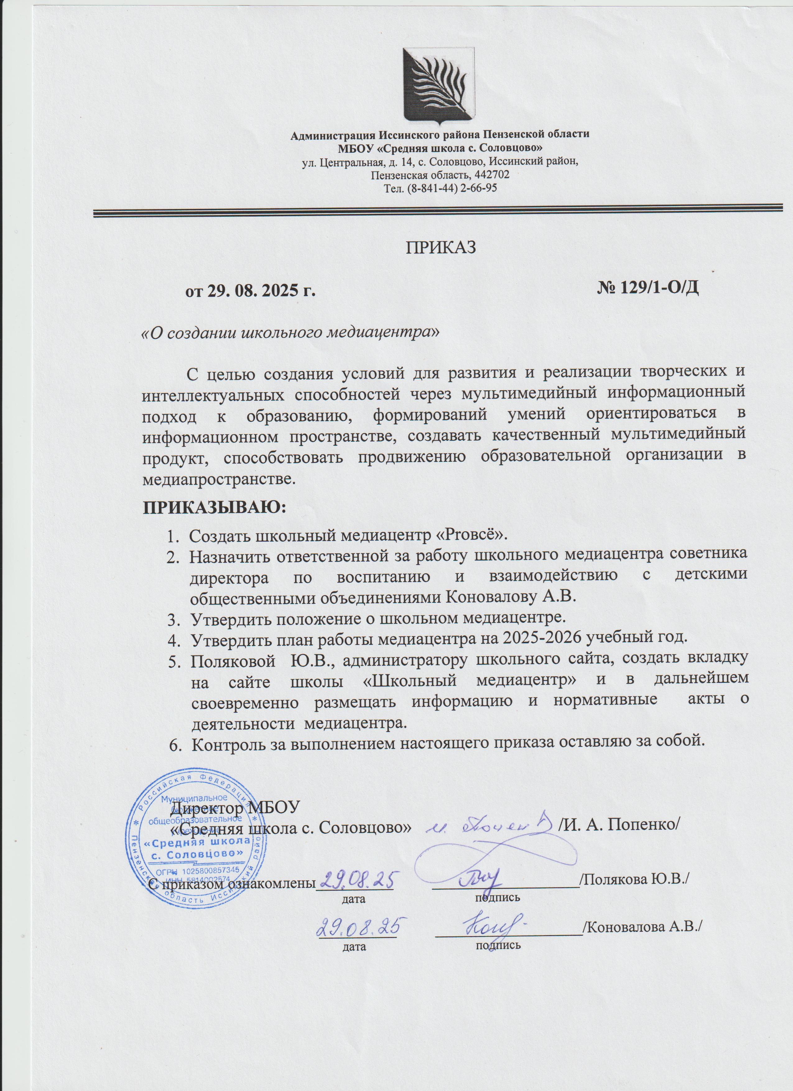 Приказ о создании школьного Медиацентра