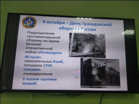 Тема классных часов в 6 и 7 классах: «Безопасность человека в ЧС и деятельность сотрудников МЧС в ЧС», а также была организована демонстрация фильмов по ГО, обучающих роликов по действиям человека в ЧС