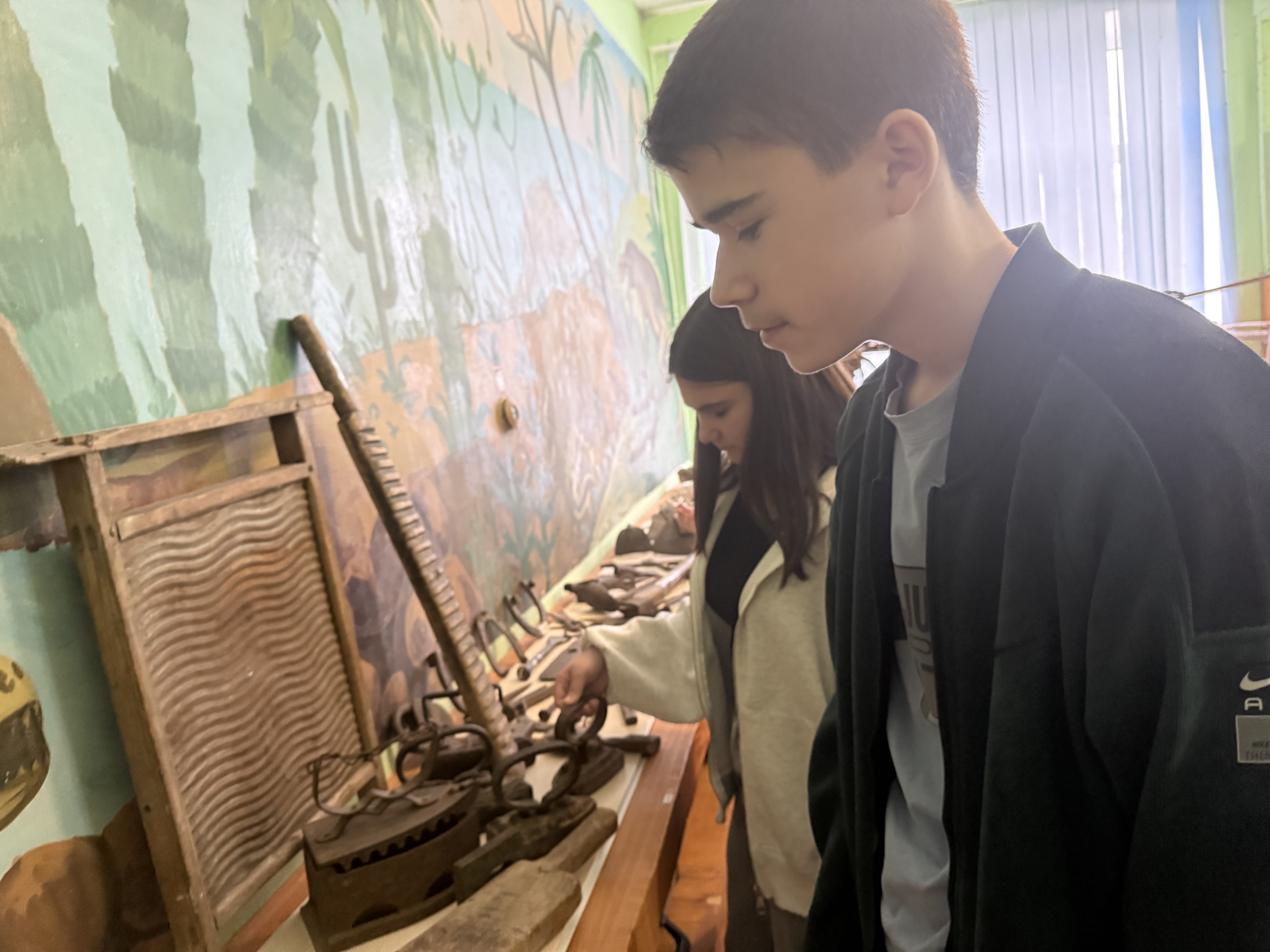 Ребята познакомились с предметами русской старины: кочергой, ухватом, чугунами, старинной посудой, коромыслом, серпом и др. В музеях экспонаты трогать нельзя, а в этом музее ребята не только трогали, но попробовали их в деле: прошлись с коромыслом, подержали утюги, разглядели прялку.