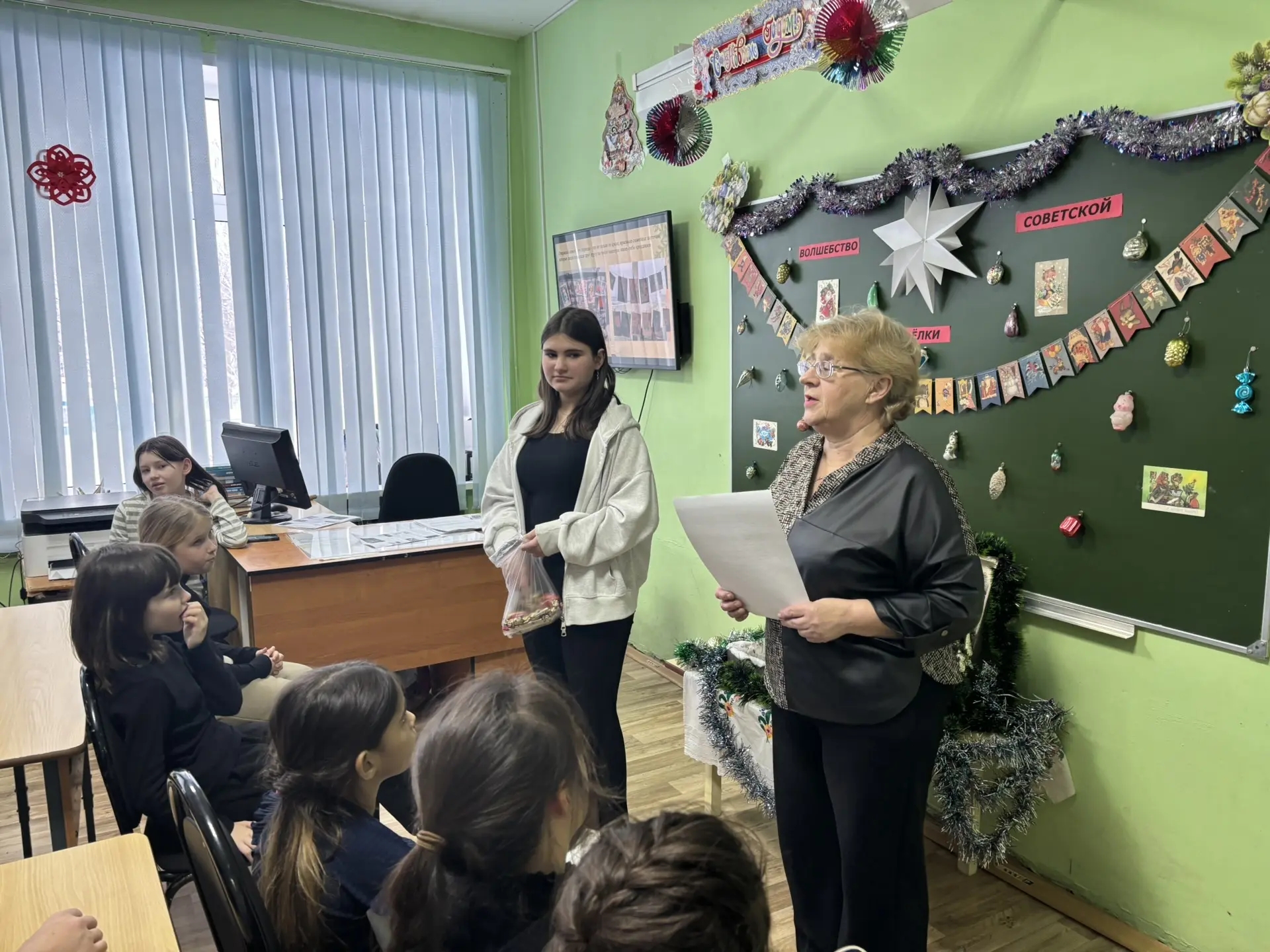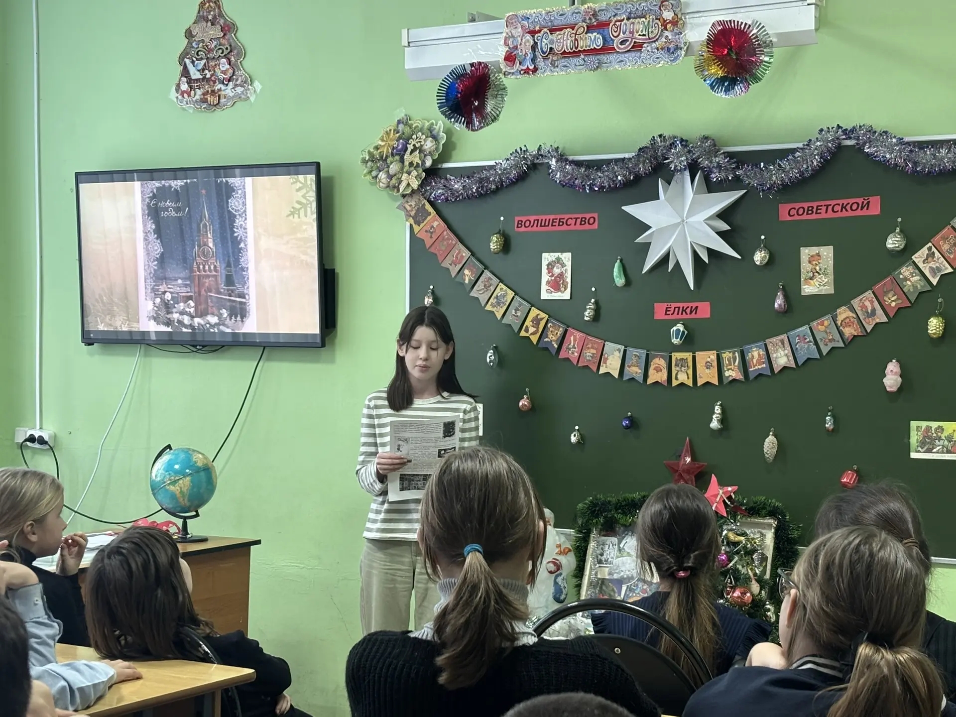 В преддверии Старого-нового года среди младших и средних классов прошло мероприятие - «Волшебство советской ёлки». В ходе программы, участниками краеведческого кружка, представлена экспозиция из ёлочных игрушек, флажков, открыток советского периода. Присутствующие узнали много интересных фактов из истории ёлочных игрушек, которые появились в России ещё в 19 веке, из чего изготовлялись новогодние украшения, как они усовершенствовались со временем. Ребята могли не только познакомиться, но и рассмотреть, потрогать советские новогодние игрушки. После познавательной части мероприятия, участников ждала увлекательная новогодняя викторина и награждение сладкими подарками.